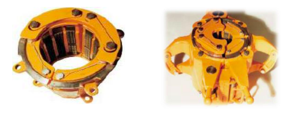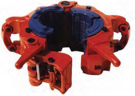 The YT elevator is an outstanding combination tool for use with any of the power tubing spiders. It has four slips each contacting 9' (228.6 mm) of pipe length. The interlocking slips form a circle around the tubing, assuring a uniform grip. Slip inserts are easily replaceable. Only one set of slip bodies is required to handle all tubing sizes from 1.315" (33 mm) through 3.1/2" (89 mm). A sturdy latch and safety latch lock combination holds the YT elevator securely in closed position.